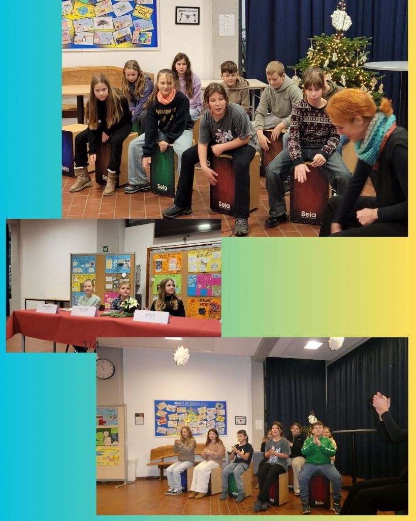 Die Jury bestand aus Frau Demandt, unserer Schulsekretärin, Frau Betram, der Schulverwaltungsassistentin, Frau Schwarzenberg von der katholisch-öffentlichen Bücherei, Frau Görbak, Lehramtsanwärterin an unserer Schule, sowie den beiden Schülersprechern Lina Bettermann und Leonard Obermann. Mit großer Aufmerksamkeit bewerteten sie Lesetechnik, Ausdruck und Interpretation der jungen Vorleserinnen. Für die musikalische Gestaltung sorgte die Klasse 5d unter der Leitung von Frau Holtgrewe, die mit rhythmischen Percussion-Beiträgen die Pausen zwischen den Vorträgen lebendig füllte und zu einer stimmungsvollen Atmosphäre beitrug.