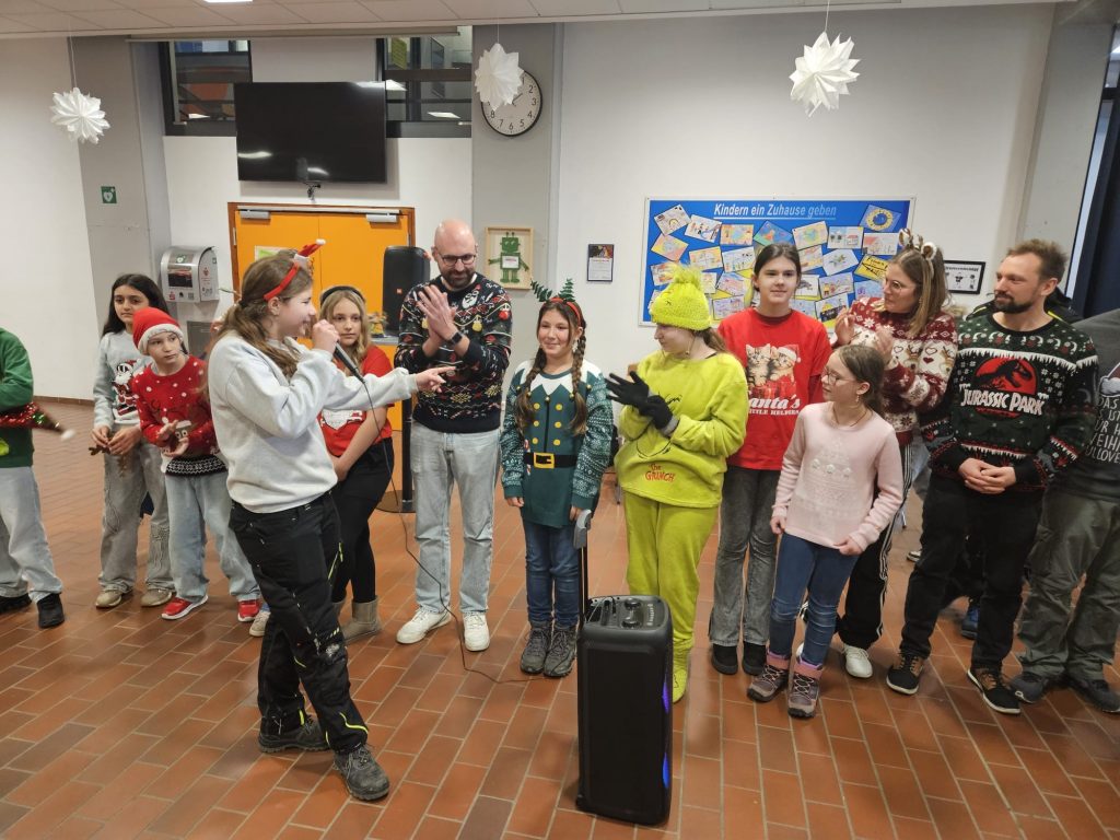 Zahlreiche SchülerInnen und LehrerInnen trafen sich heute in der Mittagspause in ihren witzigsten und skurrilsten Weihnachtspullis in der Aula, um sich bereits am vorletzten Schultag zu „Last Christmas“ und Co auf die Ferien einzustimmen.