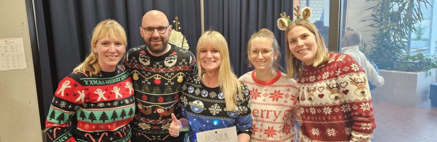 Zahlreiche SchülerInnen und LehrerInnen trafen sich heute in der Mittagspause in ihren witzigsten und skurrilsten Weihnachtspullis in der Aula, um sich bereits am vorletzten Schultag zu „Last Christmas“ und Co auf die Ferien einzustimmen.