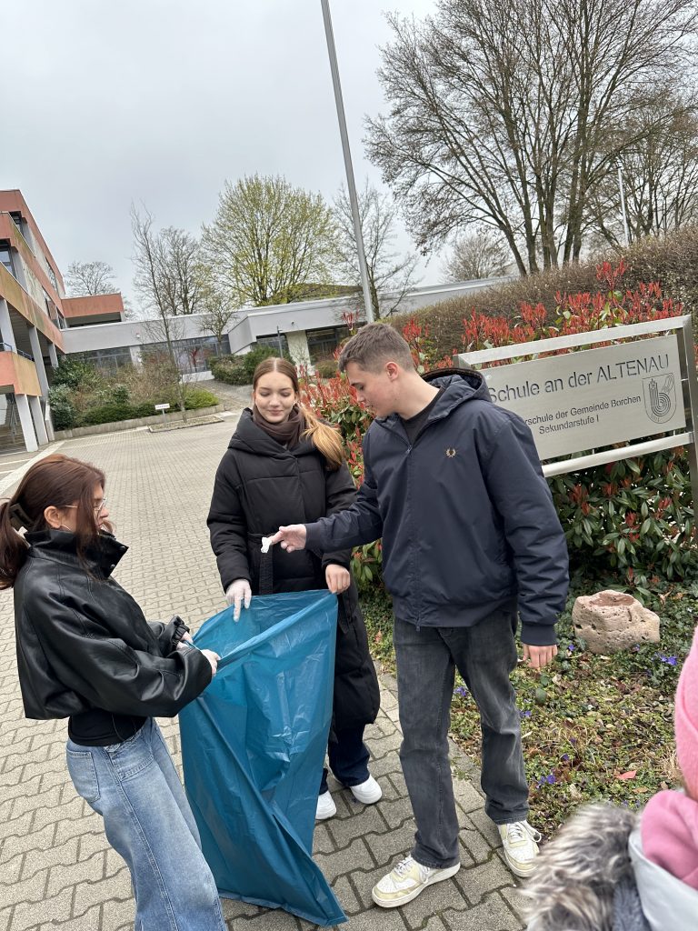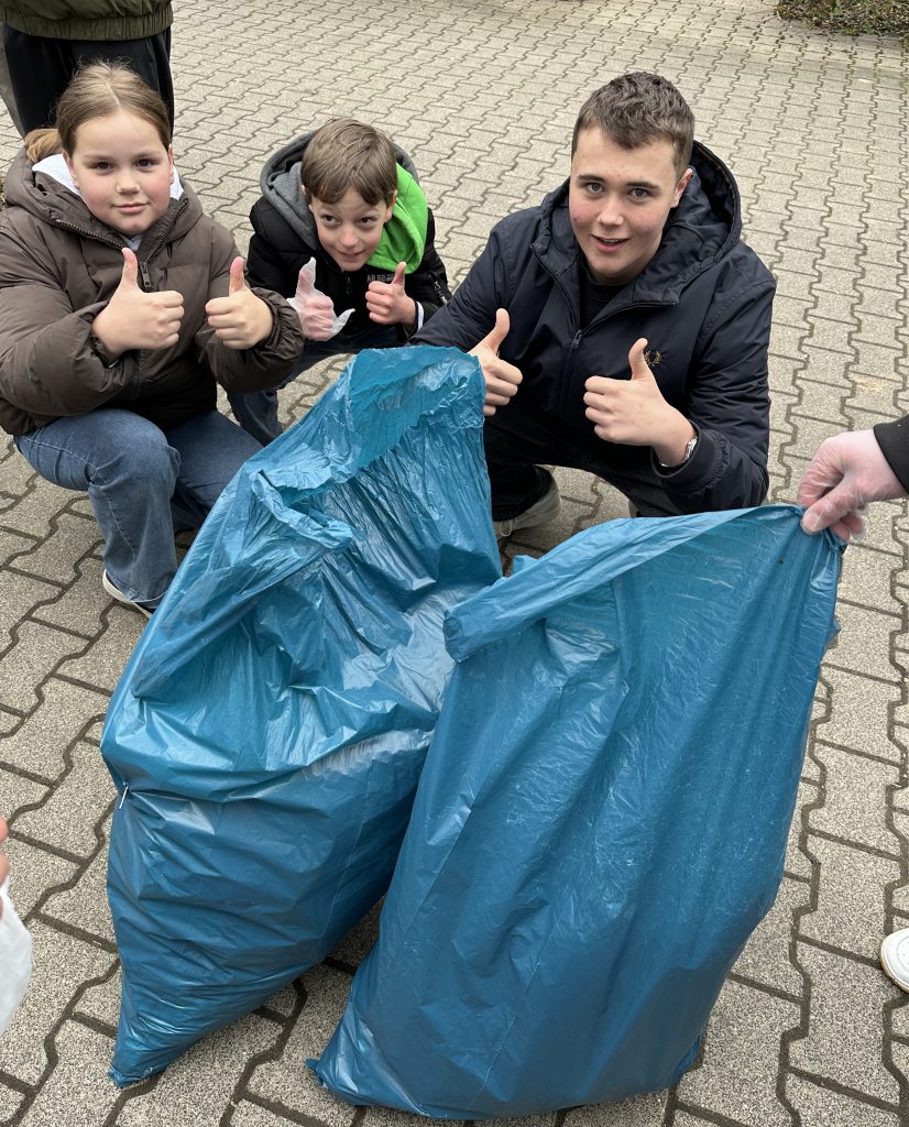 Am letzten Schultag vor den Osterferien trafen sich die KlassensprecherInnen so wie deren VertreterInnen mit den SV-Lehrern Frau Vogdt und Herrn Plückebaum, denn sie hatten eine Mission: Mission Müll! Fleißig wurden Zigarettenstummel, volle Windeln, ein Grillrost, Reifen, aber auch defekte AirPods so wie allerlei Plastik aus Büschen und von Wiesen aufgesammelt, sodass das Gelände rund um die Sekundarschule passend für die Osterferien von Müll und Abfall befreit wurde.